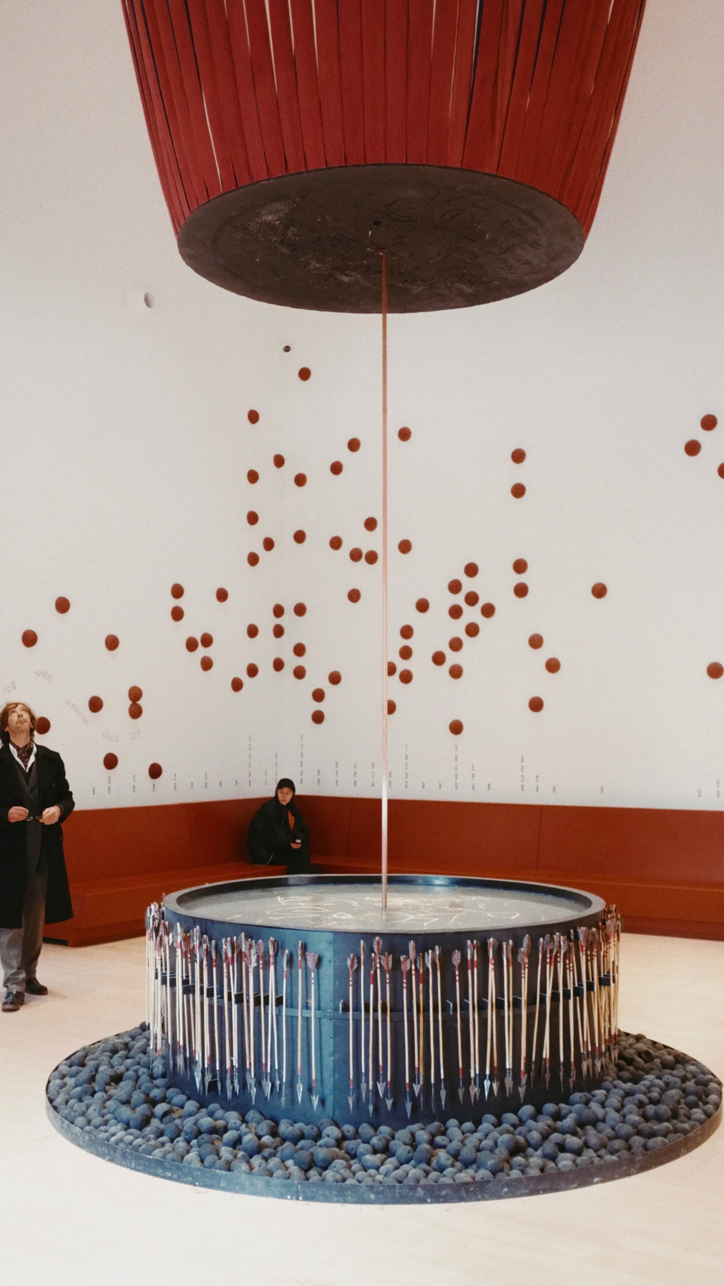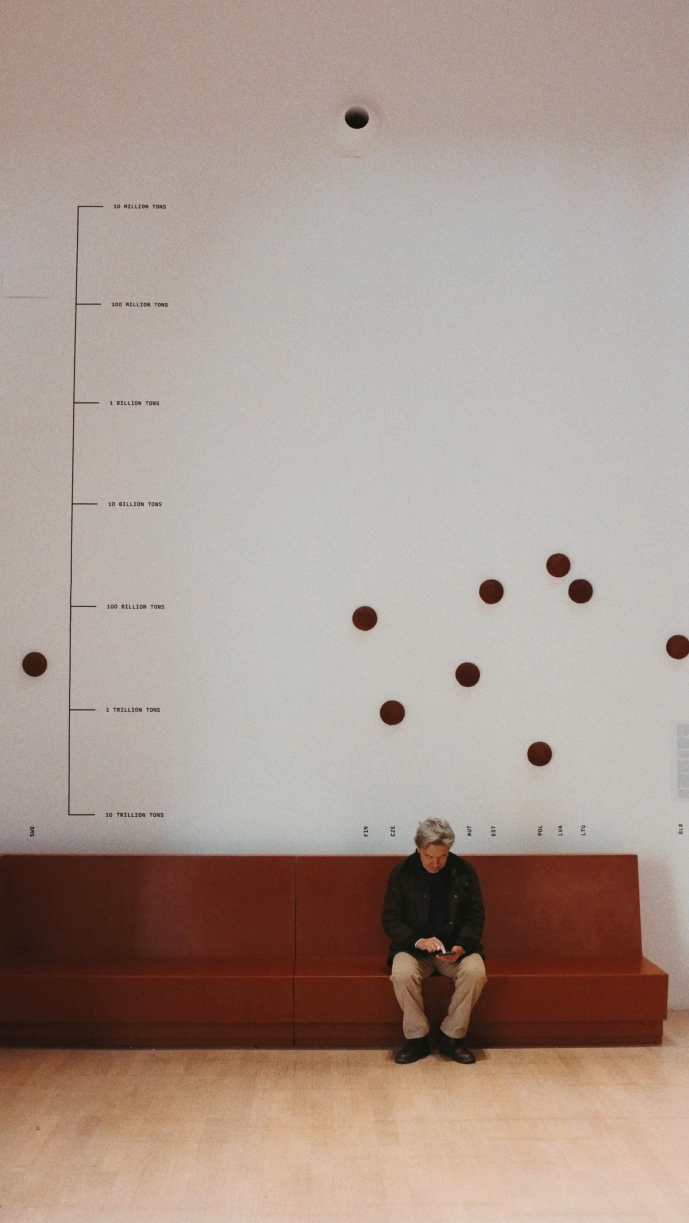 Wars and political conflicts are always fights for resources, extraction, and the exploitation of earth materials, which, in turn, shape history. At the exhibition, in the main atrium, there is a graphic line showing different countries responsible for carbon dioxide emissions within the building industry.