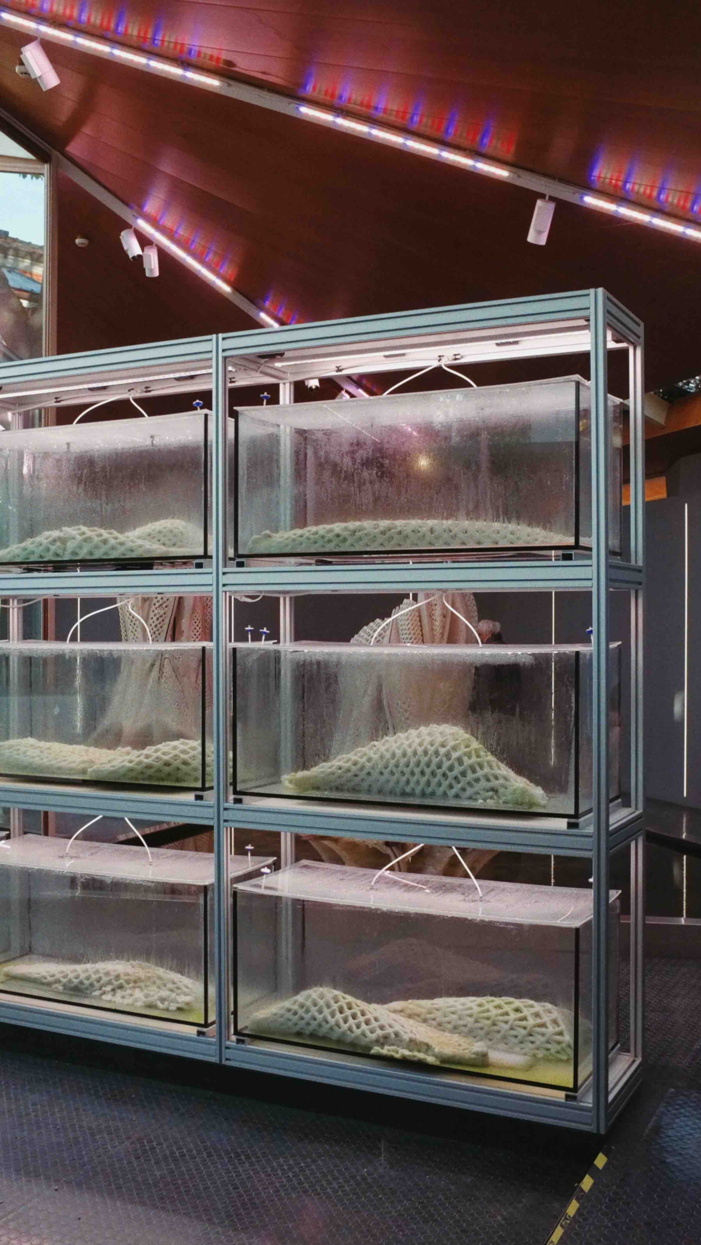 AI tries to approach a world where, unlike humans, it lacks a body. The hole in the first floor of the pavilion (built in 1956 and causing regular problems in exhibitions) this time plays the role of connecting two worlds, while also representing limited perception: it is impossible to know everything. Through this hole, natural light enters the dark capsule of the first floor. Meanwhile, on the ground floor, a plaster installation with natural flaws houses a plant that can be watered. In the rationality of this physical object, we recognize our existence as human beings.