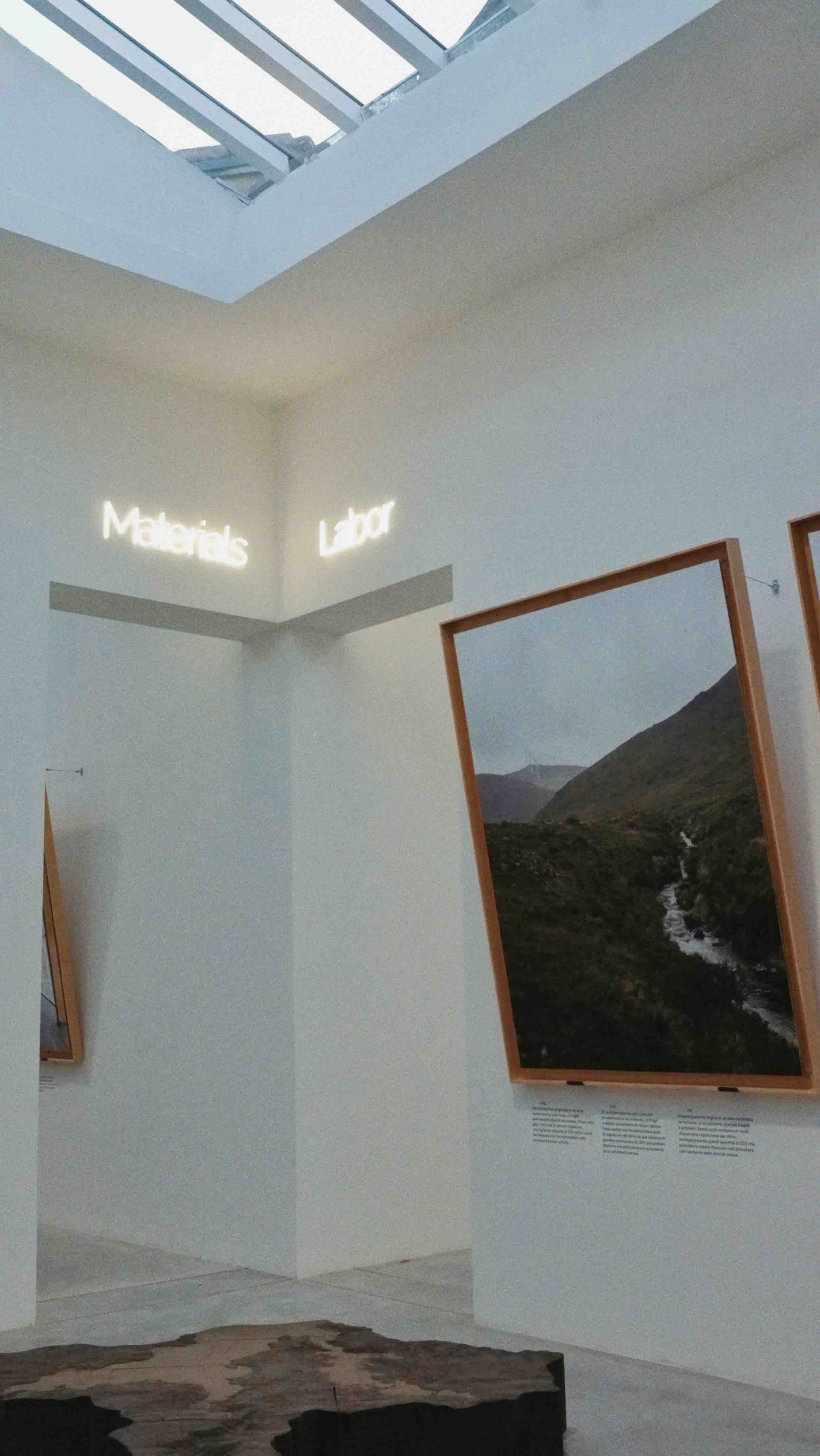 Wars and political conflicts are always fights for resources, extraction, and the exploitation of earth materials, which, in turn, shape history. At the exhibition, in the main atrium, there is a graphic line showing different countries responsible for carbon dioxide emissions within the building industry.